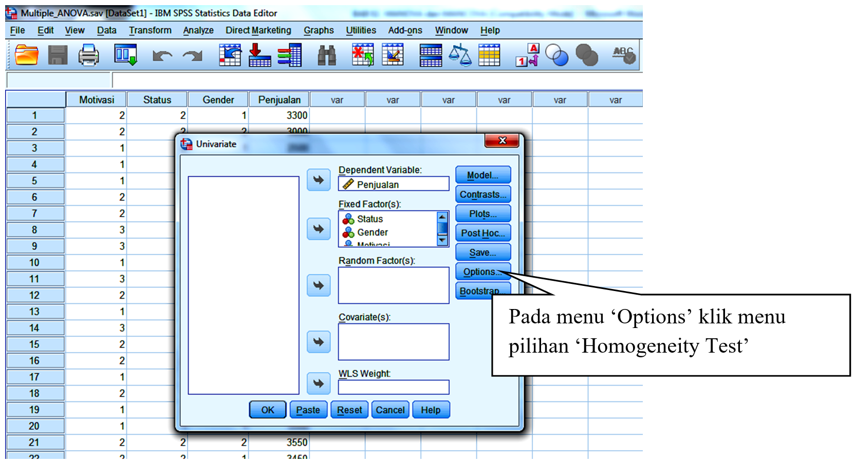 Dalam ANOVA terdapat satu variabel dependen numerik dengan beberapa variabel independen kategorikal. Misalnya: Apakah penjualan dipengaruhi oleh variabel-variabel motivasi, gender dan status berkeluarga? Untuk menjawab pertanyaan ini, kita pakai data pada file Multiple_ANOVA.sav. Silakan download dari link ini dan buka.