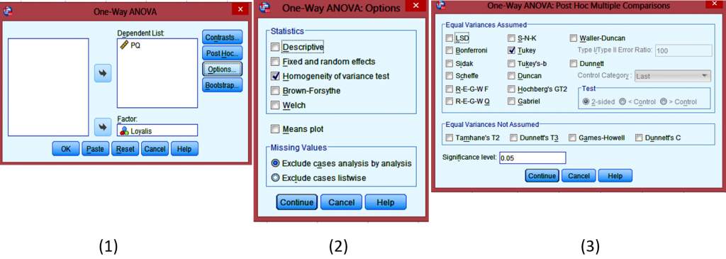 Prosedur ANOVA adalah: Analyze>compare means>One-Way ANOVA. Pada kotak dialog yang muncul, masukkan Konsumsi_kopi ke sel Dependent List dan Status_peminum pada sel Factor. Kemudian, dari menu Options, pilih ‘descriptive’ dan ‘Homogeneity of variance test’.  Pada menu Post Hoc klik Tukey, lalu klik Continue. Catatan: Uji Tukey merupakan uji post-hoc paling banyak dipakai dalam ANOVA.