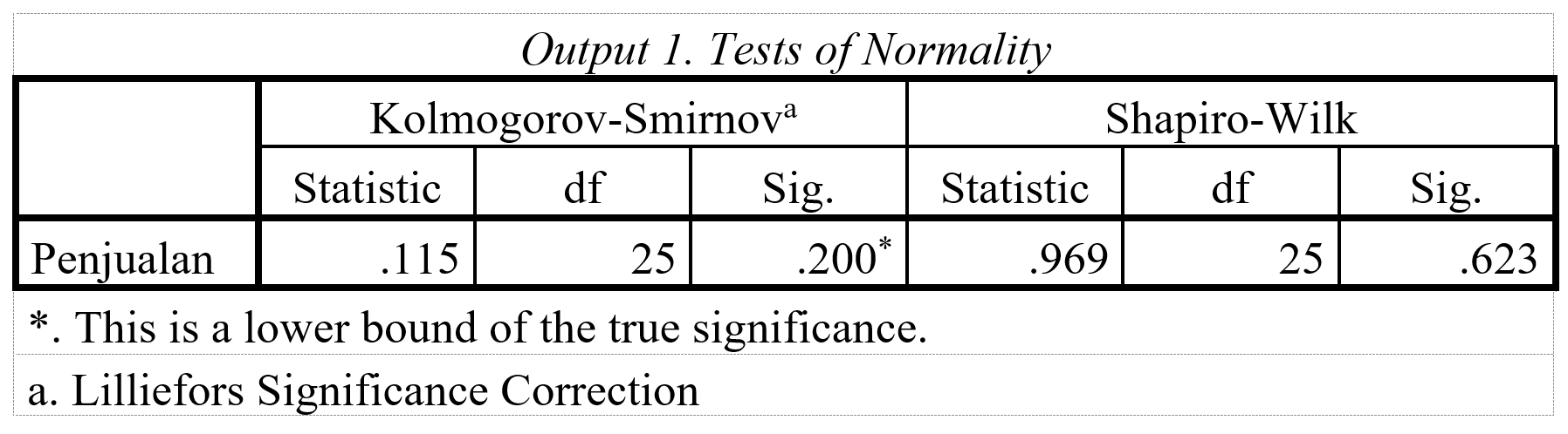 Pertama-tama kita periksa dulu apakah variabel dependen berdistribusi normal. Dengan prosedur yang sama dengan sebelumnya yang kita bahas pada ANOVA satu arah, kita peroleh hasil seperti pada Output 1.  Kesimpulannya, dengan Kolmogorov-Smirnov (nilai sig.=0.200) dan Shapiro-Wilk (nilai sig.=0.623), tidak cukup bukti menolak Ho, dengan demikian kita dapat menyatakan bahwa data penjualan berdistribusi normal.