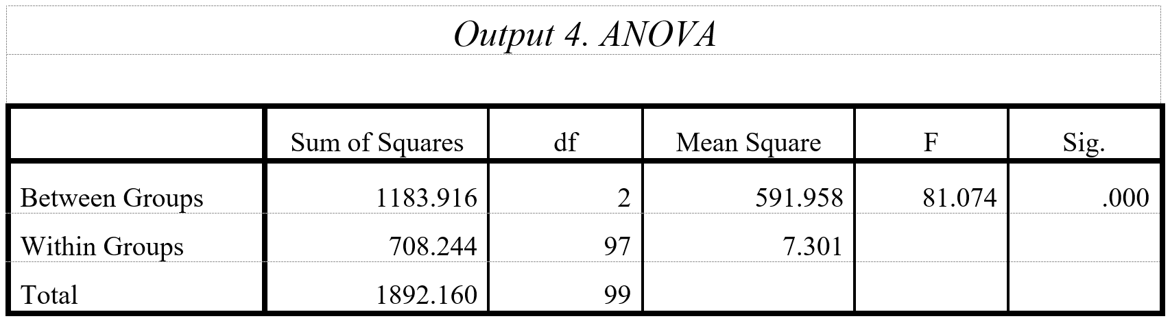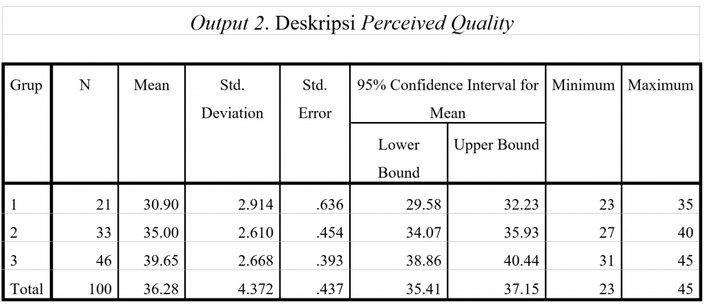 Hasil uji adalah sebagai berikut. Pada Output 4, kita bisa melihat nilai F=81.074 dengan nilai Sig.=0.000. Artinya, cukup bukti untuk menolak Ho dengan tingkat kesalahan atau α=0.000.  Jadi, terdapat perbedaan PQ paling tidak di antara dua grup.