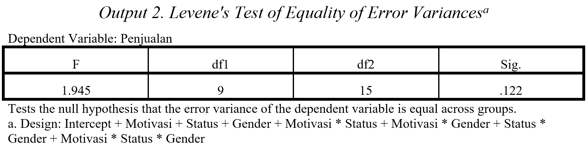 Nilai Levene Test dikonversi menjadi nilai-F=1.945, dengan Sig.=0.122. Dengan demikian, pada α=0.05 kita dapat menerima Ho yang menyatakan bahwa error variance variabel dependen pada semua grup adalah sama. Artinya, data berasal dari populasi yang sama, sehingga dari sisi ukuran, data memenuhi syarat ANOVA.