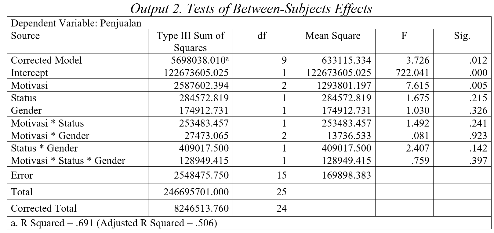 Perbedaan rata-rata penjualan yang di-adjust berdasarkan ketiga variabel independen beserta interaksi di antara ketiganya disajikan pada Output 1.  Pada tabel tersebut terlihat bahwa hanya berdasarkan variabel motivasi terdapat perbedaan penjualan (F=7.615, sig.=0.005). Kedua variabel independen lain serta interaksi di antara ketiga variabel independen tidak menyebabkan perbedaan penjualan signifikan.