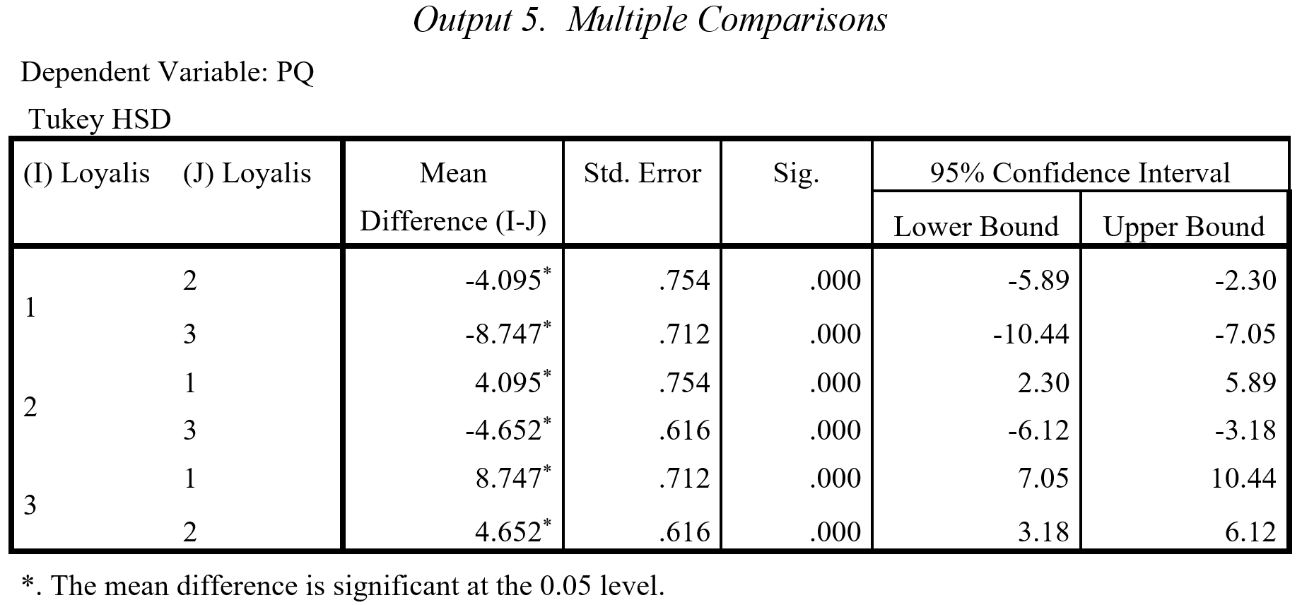 Pertanyaannya, PQ antar grup mana saja yang berbeda? Uji Tukey menjawab pertanyaan ini. Hasilnya disajikan pada Output 5.  Pada hasil tersebut terlihat bahwa perbedaan rata-rata antara grup 1 vs grup 2, grup 1 versus grup 3 serta grup 2 versus grup 3 adalah signifikan pada α=0.000.