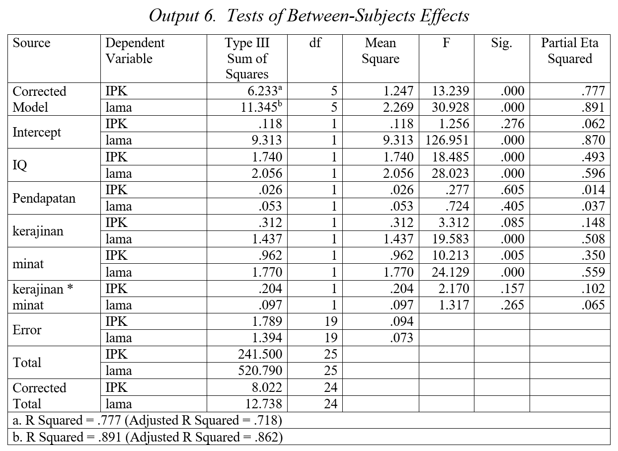 Kemudian, dari Output 3, berdasarkan uji Pillai’s Trace, Wilks’ Lambda, Hotelling’s Trace dan Roy’s Largest Root, dapat kita simpulkan bahwa IQ, kerajinan, minat serta interaksi antara kerajinan dan minat berpengaruh pada prestasi kuliah (sig.<0.05), kecuali pendapatan (sig.>0.05).