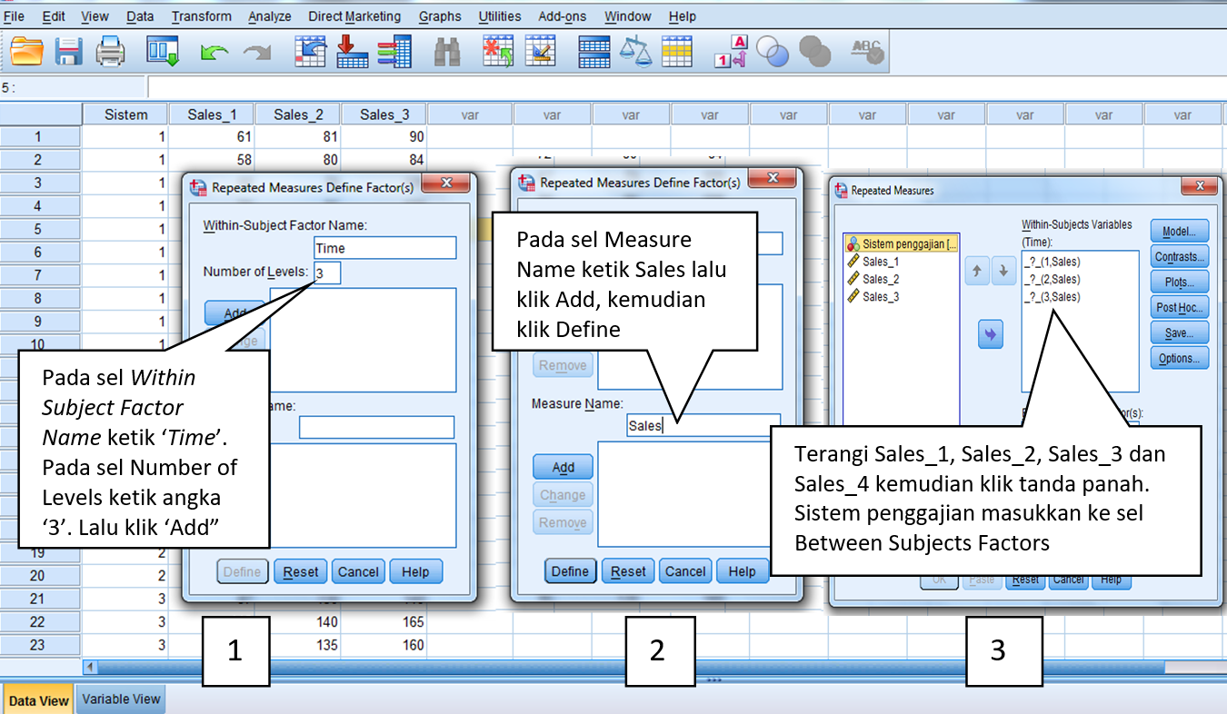 Untuk lebih jelasnya simak pertanyaan berikut: Sistem penggajian mana yang paling efektif menaikkan penjualan? Pertanyaan tersebut diajukan oleh perusahaan berbasis personal selling. Ada tiga pilihan sistem penggajian, yaitu: sistem gaji tetap, sistem gaji variabel dan sistem kombinasi (gaji tetap plus gaji variabel). Sekedar mengingatkan, sistem gaji tetap berarti gaji tetap tanpa memperhitungkan hasil penjualan sales representatif. Gaji variabel berarti besarnya gaji didasarkan pada penjualan sales representatif. Untuk menjawab pertanyaan tersebut, selama satu tahun, perusahaan menerapkan masing-masing sistem penggajian pada tiga kelompok sales representatif. Lalu, dari setiap kelompok dicatat volume penjualan setiap empat bulan, sehingga dalam satu tahun, dilakukan tiga kali pencatatan. Nah, teknik analisis yang digunakan untuk masalah ini adalah repeated measures ANOVA.