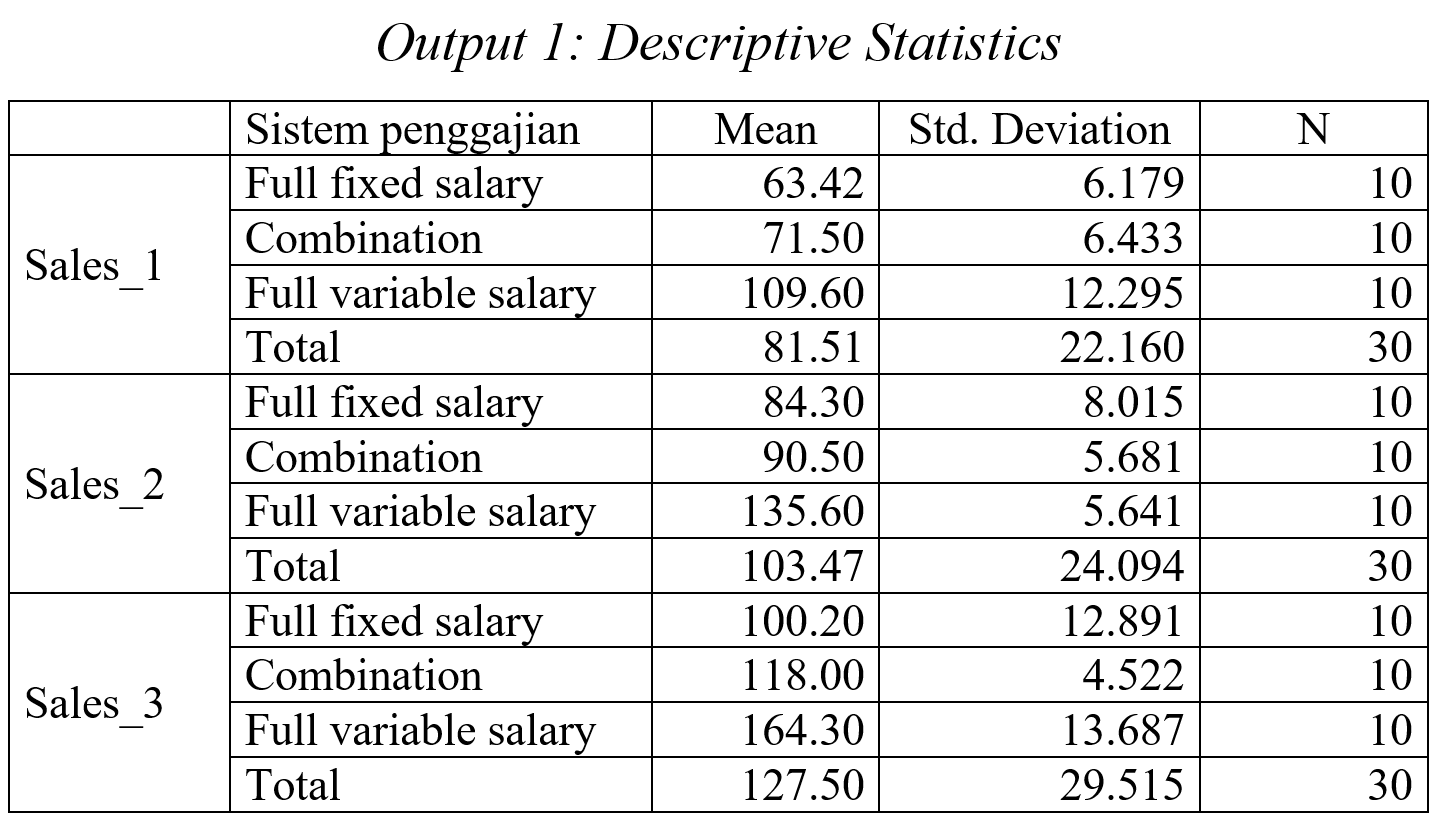 Statistik deskriptif menginformasikan rata-rata, standar deviasi dan jumlah peserta (N). Data ini memberi gambaran bahwa pada ketiga trimester, rata-rata penjualan full variable salary paling tinggi, diikuti oleh combination dan terakhir full fixed salary. Kalangan manajemen sudah dapat mengambil keputusan tentang sistem penggajian mana yang diambil berdasarkan data ini. Namun, kalangan peneliti memerlukan ulasan-ulasan berbasis statistik, seperti di bawah ini.