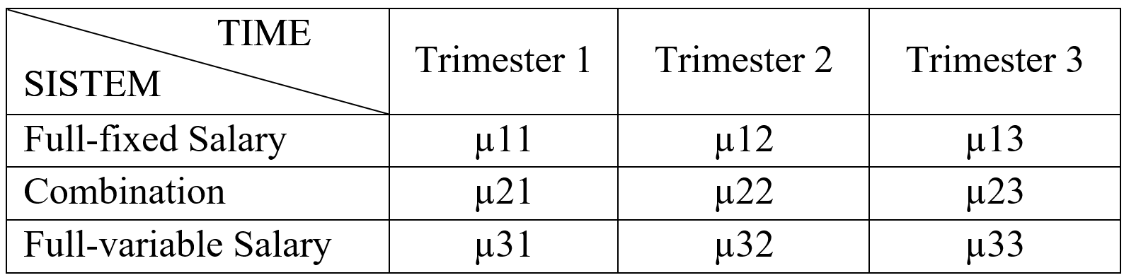 Interaksi antara ‘Time’ dan ‘Sistem’ menghasilkan sembilan kategori. Lihat tabel berikut. Simbol µij menyatakan rata-rata penjualan pada setiap kategori.