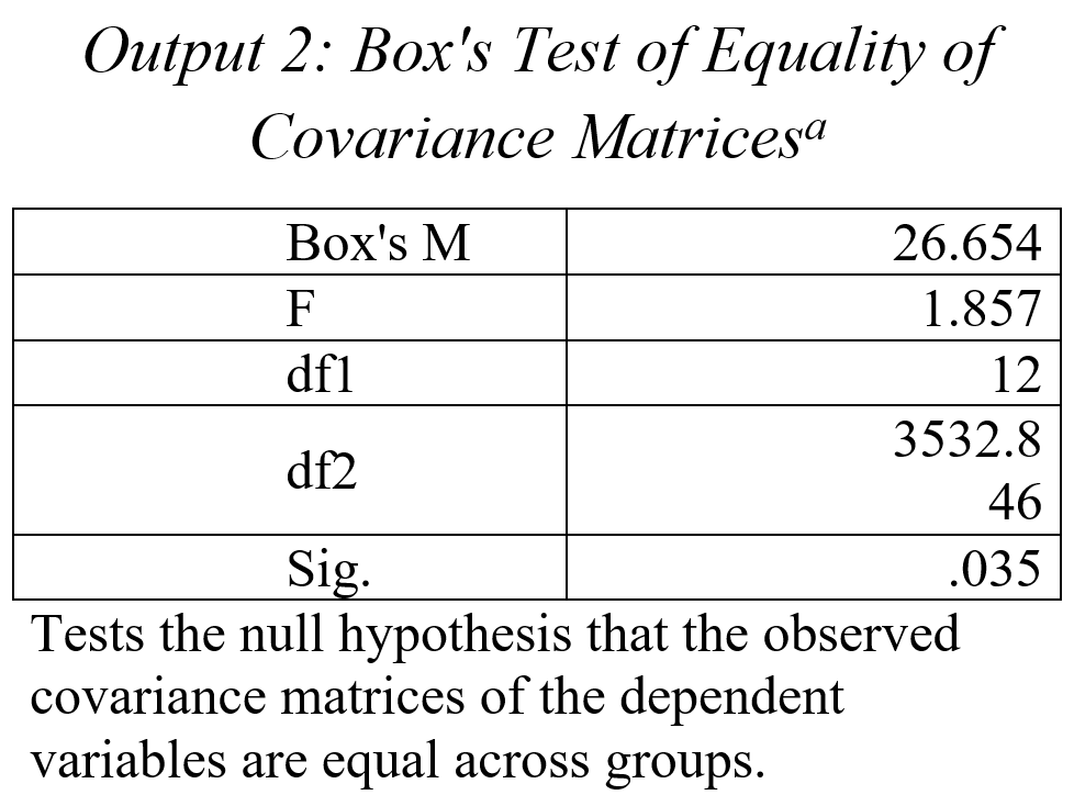 Pada Output 2, nilai Box’s M adalah 26.654 dan dirubah menjadi nilai F=1.857, dengan nilai sig.=0.035. Karena itu, pada batas α=0.05, tidak cukup bukti untuk menerima Ho Dengan demikian, dapat dinyatakan bahwa matrik kovarian variabel-variabel dependen adalah sama antar grup.