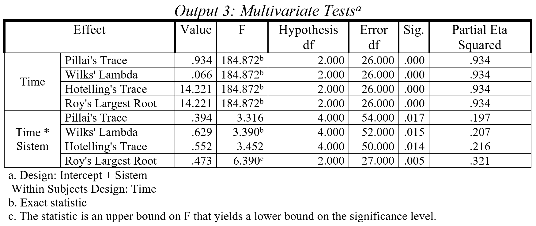 Interaksi antara ‘time’ dan ‘sistem’ juga berpengaruh pada nilai multivariat. Keempat kriteria memberikan nilai yang berbeda-beda. Kalau berdeda, kita ambil satu kriteria: Wilks’ Lambda (Field, 2012). Nilainya adalah 0.629, yang ditransfer ke dalam nilai F=3.390, dengan nilai sig.=0.015. Artinya, interaksi antara ‘time’ dan ‘sistem’ berpengaruh pada nilai multivariat. Besarnya pengaruh dinyatakan oleh partial square eta sebesar 0.207. Artinya, interaksi antara ‘time’ dan ‘sistem’ dapat menjelaskan 20.7% varian nilai multivariat.