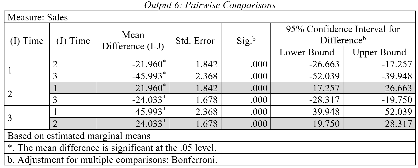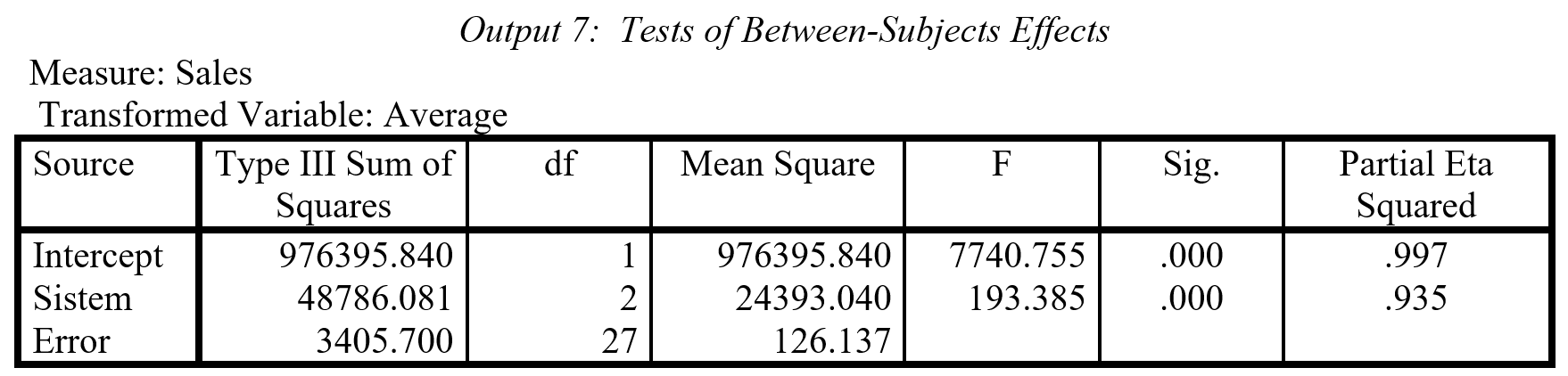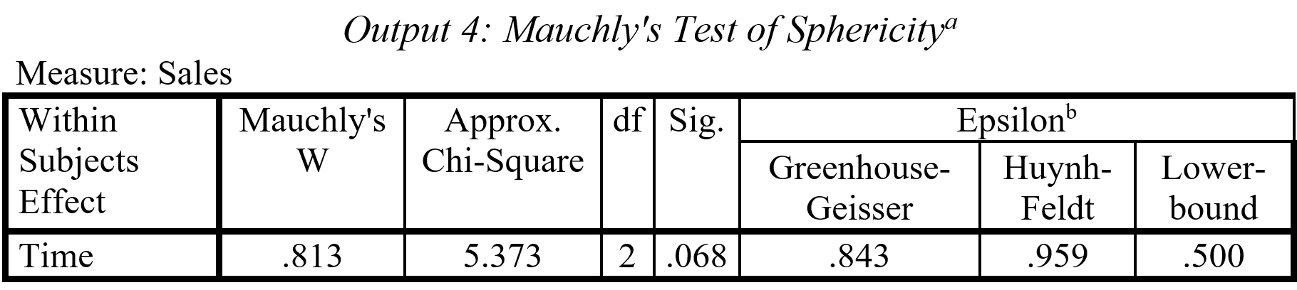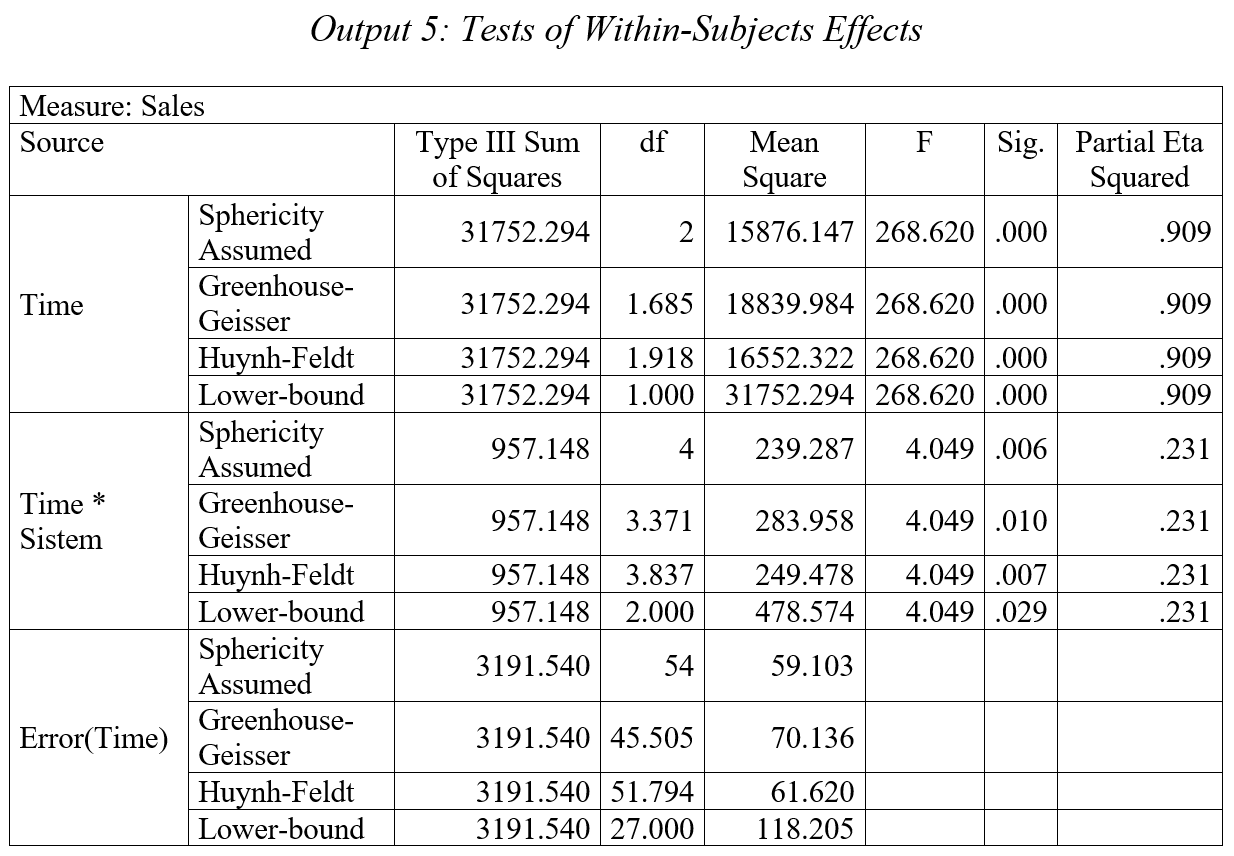 Walaupun tidak ada variabel multivariat, repeated measures ANOVA memperlakukan variabel dependen, dalam hal ini penjualan dari empat kwartal berbeda, sebagai variabel multivariat. Nilai variat diekstrak secara linier dari ke tiga kelompok penjualan. Dari Output 3 terlihat bahwa keempat kriteria pengaruh multivariat (Pillai’s Trace, Wilks’ Lambda, Hotelling Trace, Roy’s Largest Root), memiliki nilai F yang sama, yang signifikan pada α=0,000. Kekuatan pengaruh ini dinyatakan oleh partial eta squared=0.934. Artinya, ‘time’ dapat menjelaskan 93,4% varian nilai multivariat.