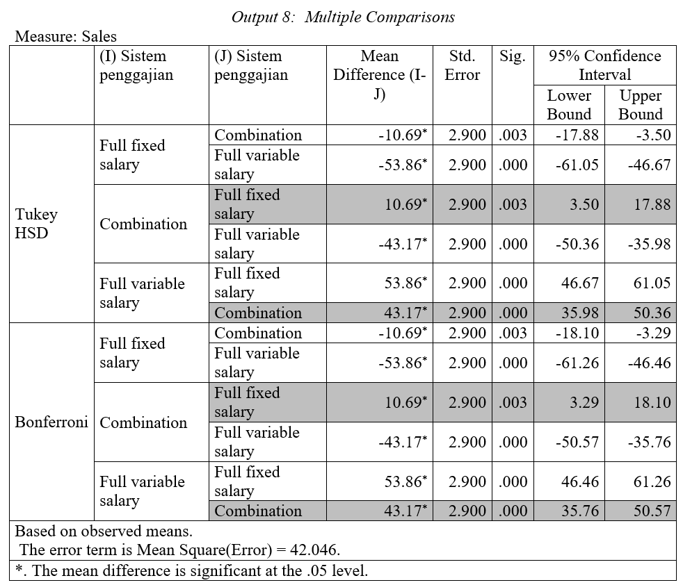 Pertanyaannya, bagaimana perbandingan rata-rata penjualan antar sistem penggajian? Output 8 menunjukkan penjualan rata-rata sistem kombinasi lebih tinggi 10.69 dibanding sistem penggajian tetap. Rata-rata penjualan sistem penggajian variabel penuh lebih tinggi 43.17 dibanding sistem penggajian kombinasi. Berdasarkan Uji Tukey dan Bonferroni kita dapat disimpulkan bahwa perbedaan rata-rata sistem penggajian tersebut adalah signifikan.