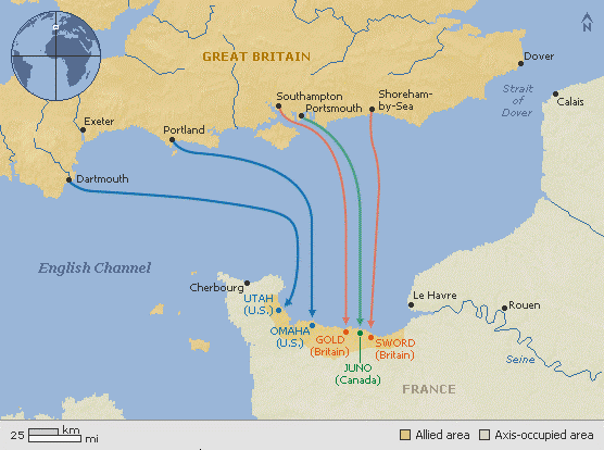 Di sepanjang garis pantai Perancis yang menghadap selat Inggirs, ada empat tempat yang dipertimbangkan untuk mendaratkan pasukan, yaitu: Brittany Peninsula, the Cotentin Peninsula, Normandy, and Pas de Calais. Pada gambar ini hanya Normandy dan Pas de Calais yang tampak. Walaupun paling dekat ke Inggris, Pas de Calais tidak dipilih karena pertahanan Jerman di zona ini sangat kuat. Ada tiga juta ranjau ditanam di bibir pantai dan ratusan meriam terpasang pada bungker-bungker kokoh di pinggir pantainya.