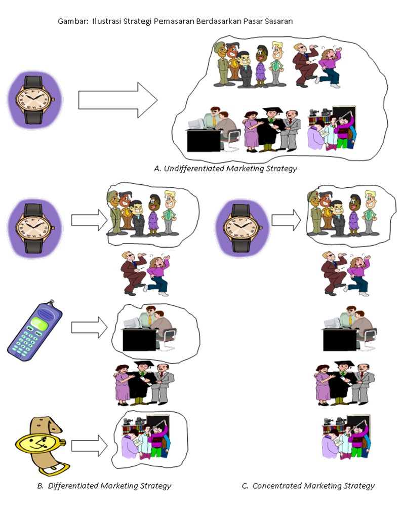 Dalam undifferentiated marketing strategy, perusahaan membuat hanya satu paket bauran pemasaran untuk seluruh pasar. Perusahaan mengabaikan perbedaan setiap segmen, bahkan memperlakukan semua segmen sebagai satu pasar. Dengan undifferented marketing strategy, perusahaan membuat beberapa bauran pemasaran yang ditujukan pada beberapa segmen. Sedangkan dengan concentrated marketing strategy, perusahaan membuat hanya satu paket bauran pemasaran yang ditujukan pada hanya satu segmen.