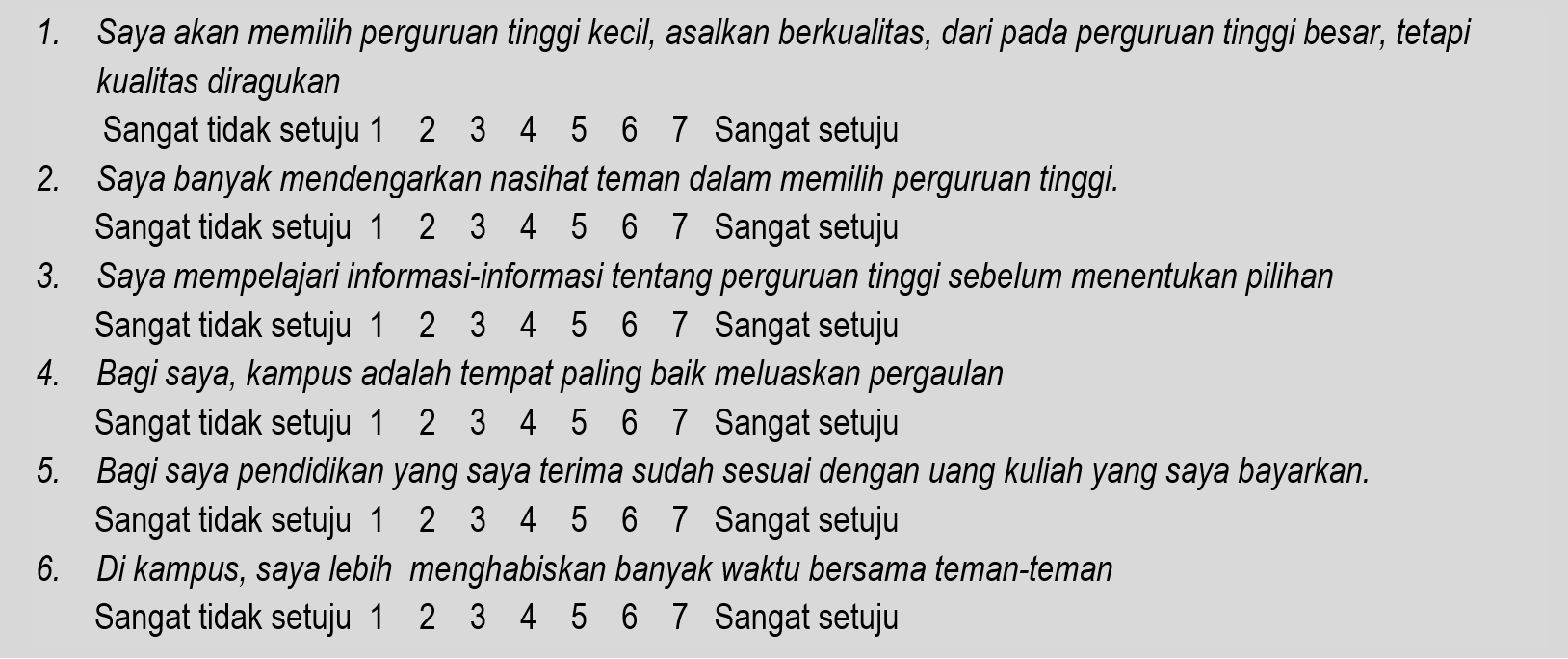 Sebuah perguruan tinggi melakukan segmentasi terhadap mahasiswanya berdasarkan motivasi (yang ini jelas masuk variabel perilaku) masuk perguruan tinggi. Pertanyaan-pertanyaan yang diajukan adalah sebagai berikut:
